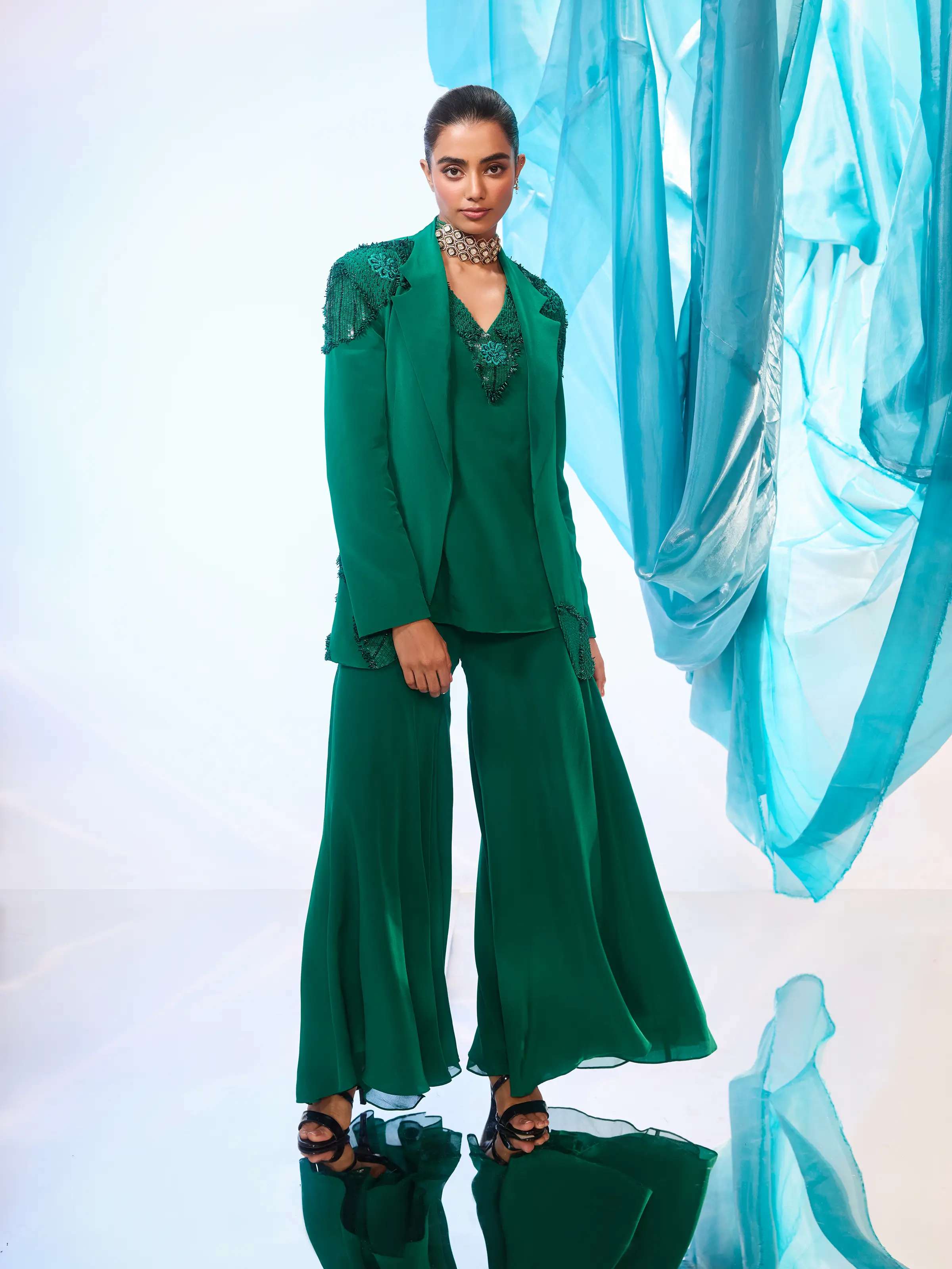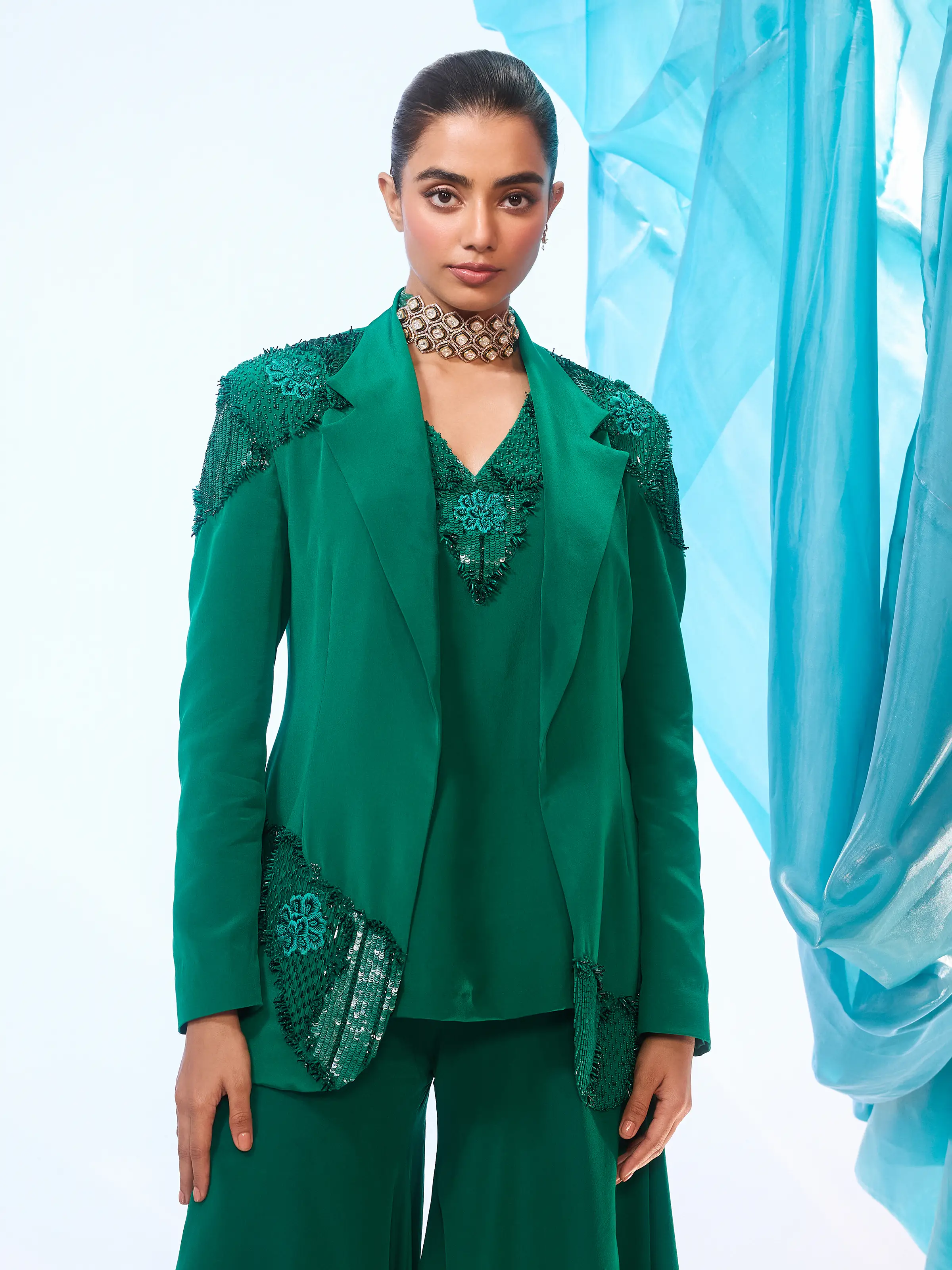 This power suit that includes a hand-embroidered jacket and camisole paired with wide-leg pants in emerald green is a chic outfit that can be worn during the day or at night.