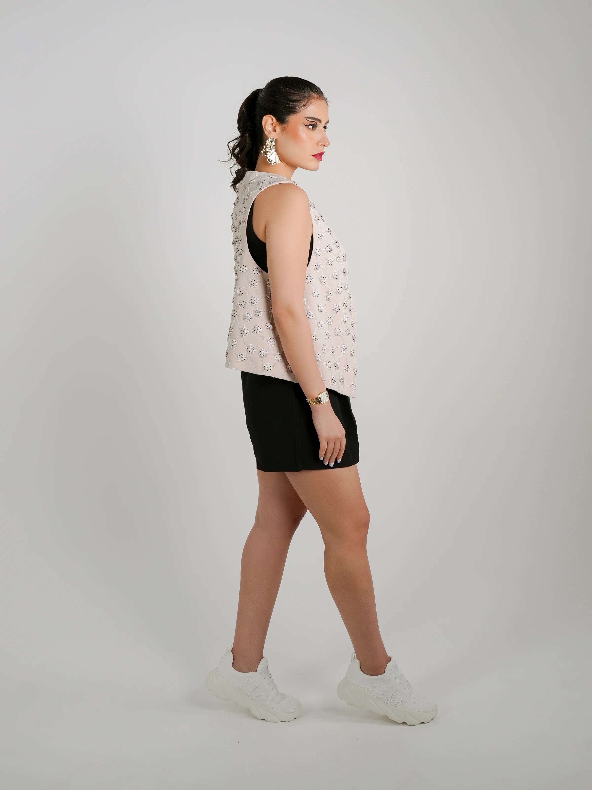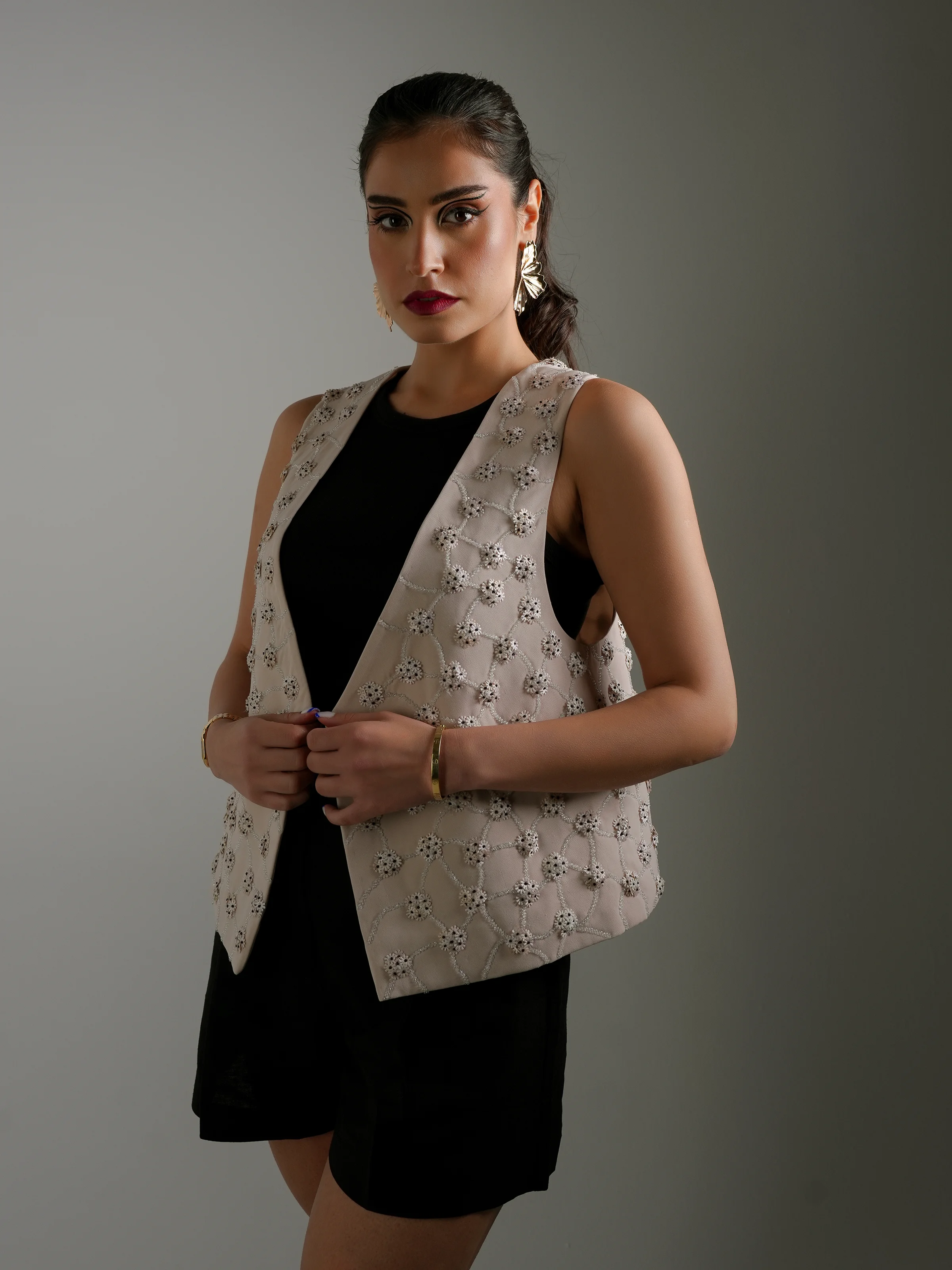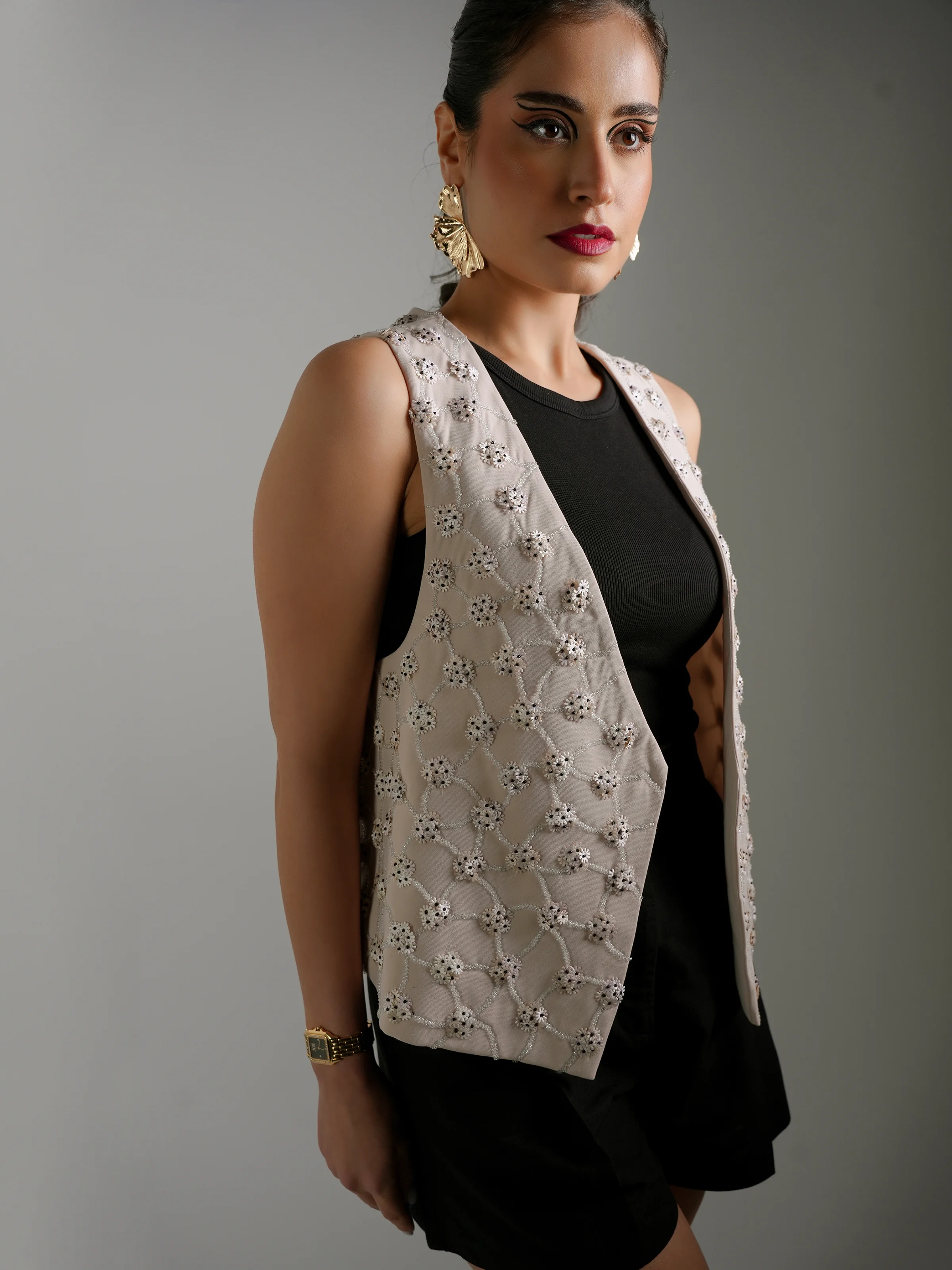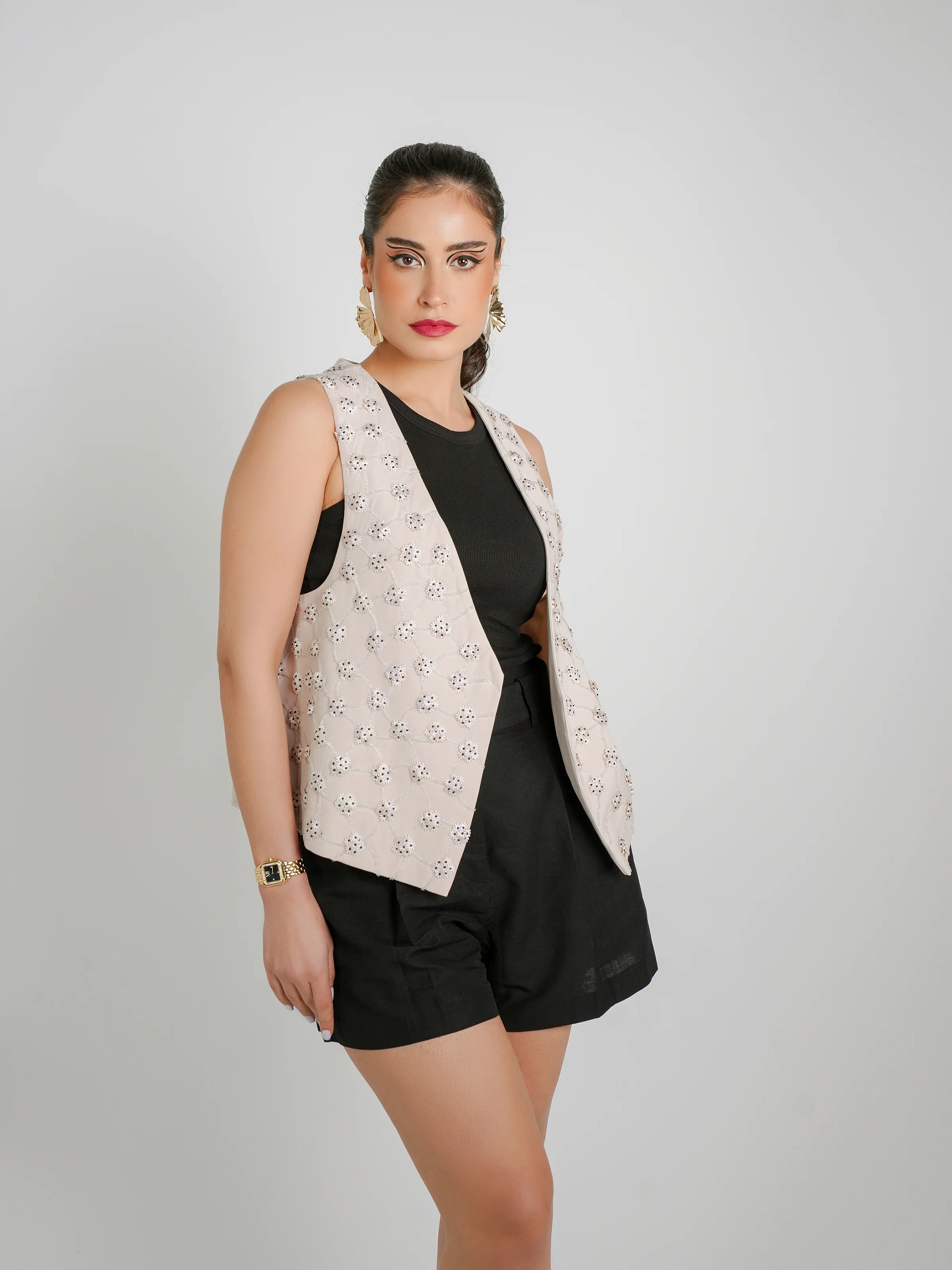 A hand-worked Gilet that is both elegant and feminine, featuring small daisy flowers and bead embroidery. This stylish Gilet blends beautifully with just about anything that can elevate an outfit from drab to fab.